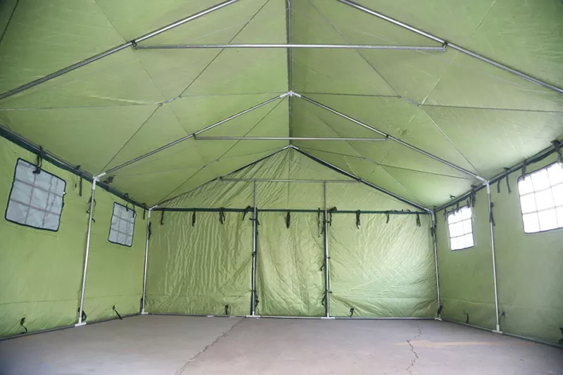 Стандардна конфигурација грађевинског шатора 5×6м укључује двоја врата и шест прозора, што олакшава приступ особљу, природно осветљење и циркулацију ваздуха. Прозори имају структуру са решеткастим узорком са независним завесама, омогућавајући зонско управљање према функционалним потребама.